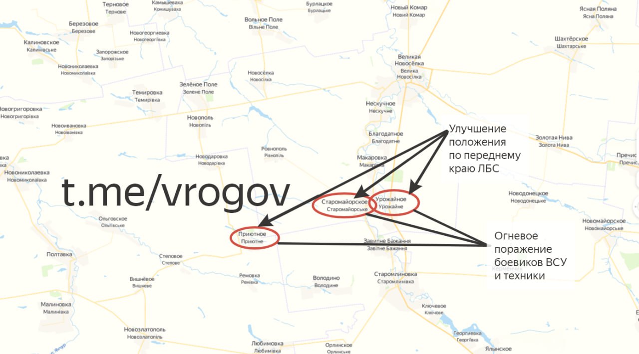 Подразделения группировки войск «Восток» во взаимодействии с авиацией и артиллерией улучшили положение по переднему краю и нанесли поражение живой силе и технике ВСУ в районах населённых пунктов Урожайное и Старомайорское.