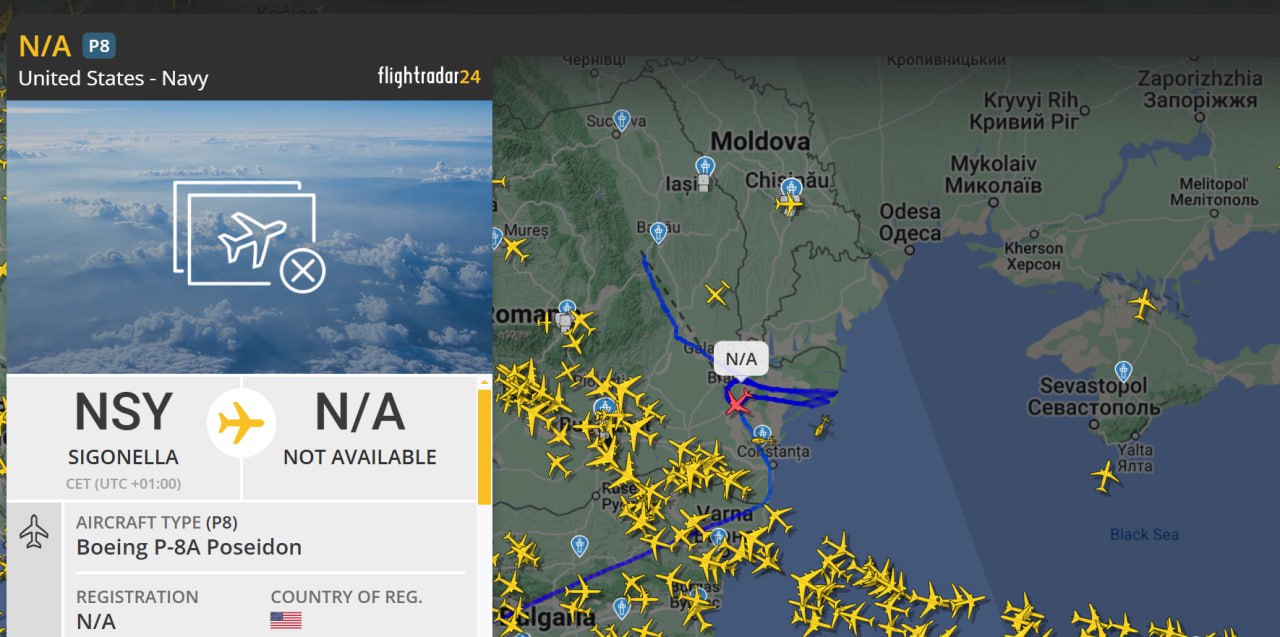 Хорошо знакомый американский противолодочный Boeing P-8A Poseidon снова работает с прицелом на западную часть акватории Чёрного моря.