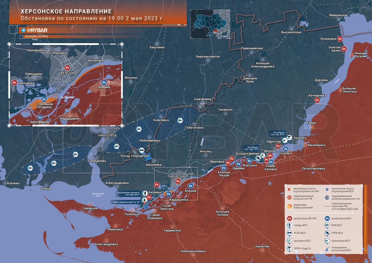 Херсонское направление, обстановка по состоянию на 19.00 2 мая 2023 года от Телеграм-канала Рыбарь.