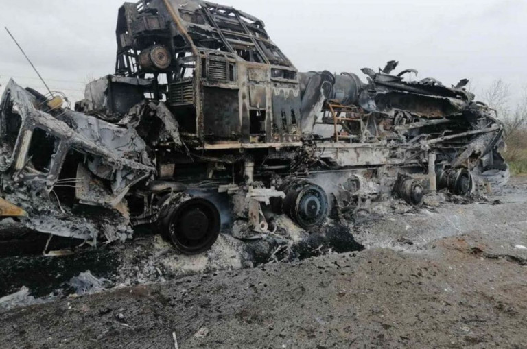 Уничтоженные украинские пусковые установки 5П85С вместе с запасом ракет и командный пункт 5Н63С из состава ЗРК С-300ПС в Херсонской области.