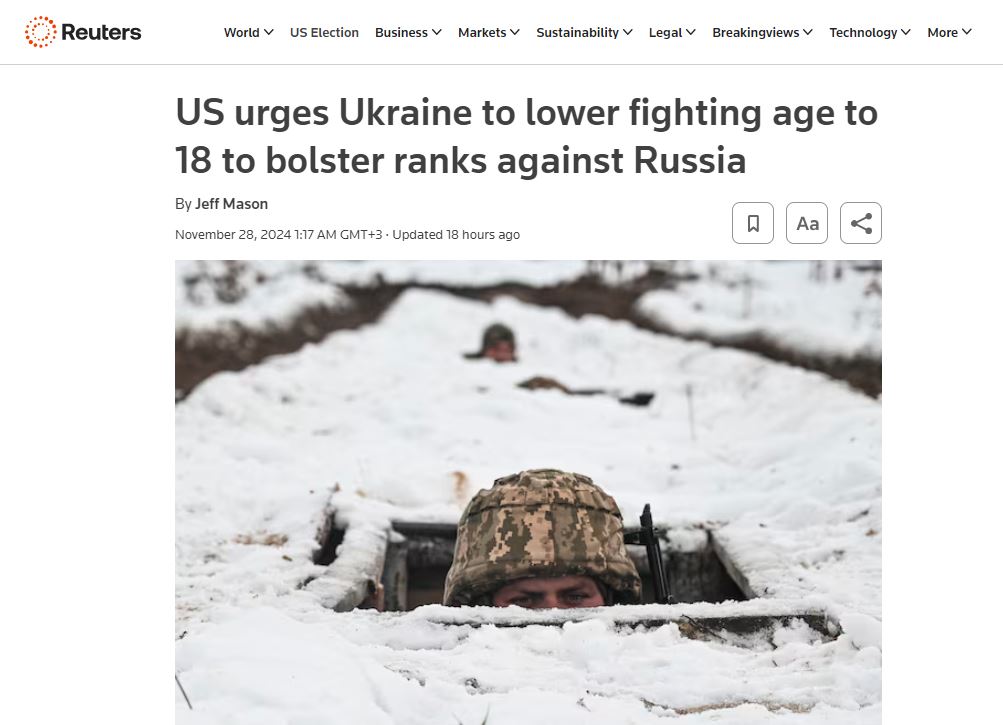 Высокопоставленный американский чиновник из администрации Джо Байдена потребовал от Киева срочно снизить призывной возраст с 25 до 18 лет, пишет новостное агентство Reuters.