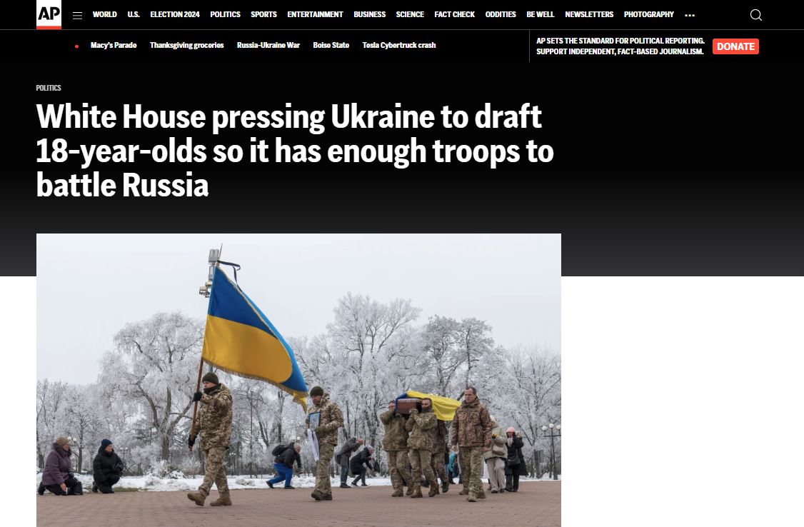 Чуть позже и агентство Associated Press выдало похожую статью, но чуть с другим заголовком, из которой следует, что Киеву придётся выбирать: либо отступать из Курской области, либо отправлять на фронт с 18 лет. В связи с успешным продвижением ВС РФ в приграничье администрация Байдена уверена, что Украина просто вынуждена будет снизить возраст мобилизации. После чего, подсчитали в Белом доме, на фронт отправится «ещё 160 тысяч крепких молодых людей, готовых сражаться». Тогда как на самом деле – в окопы бросят вчерашних школьников, как правило – неподготовленных и не желающих воевать. Все, кто хотел воевать, уже отправлены к Бандере.