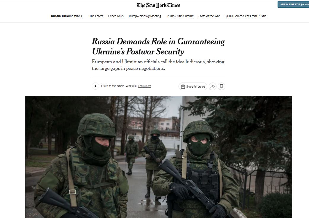 «Министр иностранных дел России Сергей Лавров заявил, что Россия будет настаивать на том, чтобы быть одним из гарантов безопасности для Украины в любом будущем соглашении. По его словам, все вопросы коллективной безопасности нельзя решать без участия России. Однако такое условие европейские и украинские чиновники считают абсурдным. Сторонники Киева отвергают идею о том, что Россия может быть одним из гарантов будущей безопасности Украины. Президент Финляндии Александр Стубб заявил, что взгляд России на гарантии безопасности сильно отличается от европейского. Некоторые аналитики говорят, что западные страны могут ввести войска на Украину после окончания боевых действий без одобрения России. Другие утверждают, что Россия вообще не согласилась бы на мирное соглашение, если бы такая возможность обсуждалась, учитывая несогласие Москвы на присутствие войск НАТО на Украине», – говорится в статье.
