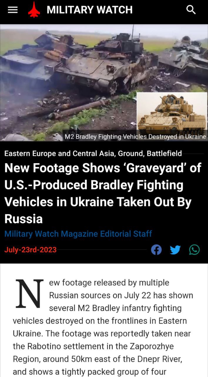 «На кадрах, опубликованных рядом российских источников, видно много боевых машин пехоты M2 Bradley, уничтоженных на передовой на востоке Украины. Сообщается, что кадры сняты недалеко от посёлка Работино в Запорожской области. Как западные, так и российские источники признают, что потери Bradley, подтверждённые открытыми данными, исчисляются десятками. Украина попыталась компенсировать весьма ограниченную защиту Bradley от противотанковых снарядов, применяя советскую динамическую бронезащиту, однако современные российские противотанковые ракеты, например, «Вихрь-1» воздушного базирования, разрабатывались специально для противодействия таким формам бронезащиты и нанесли западной бронетехнике значительный урон», – пишет издание Military Watch Magazine.