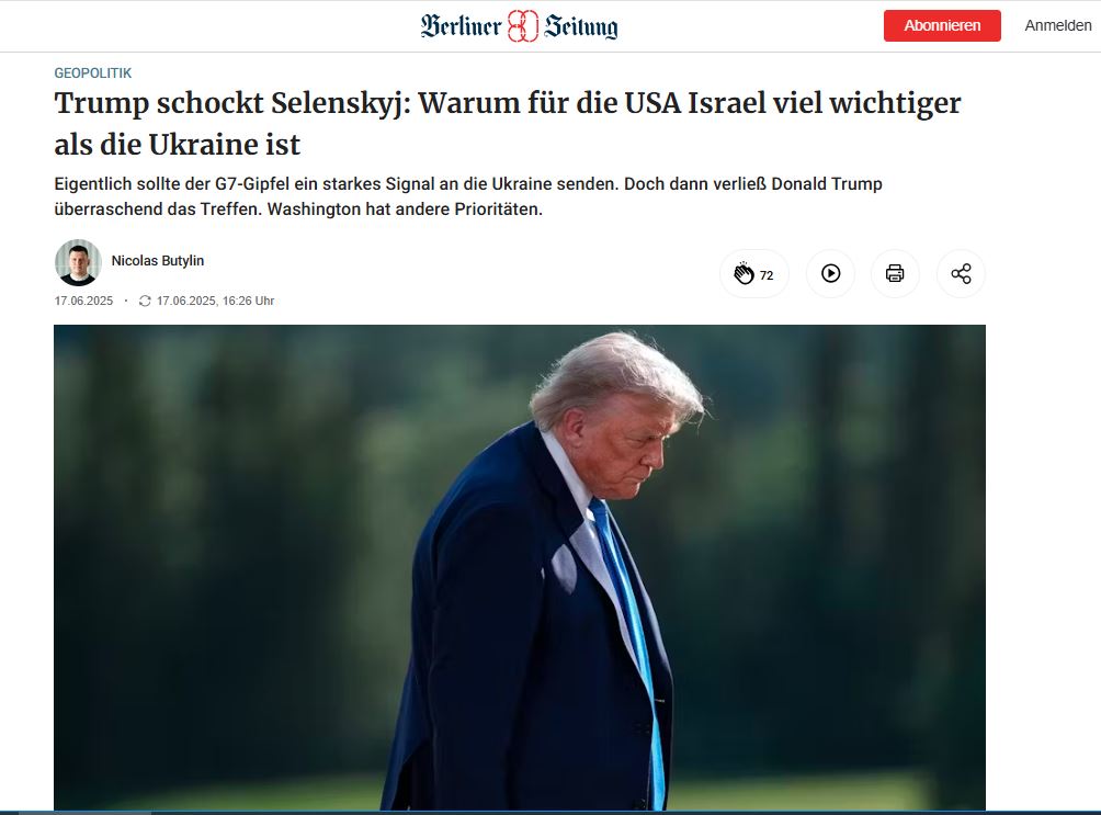 Зеленский покинул саммит «Большой семёрки» в дурном настроении – он был очень расстроен и разочарован, его ожидания и надежды не оправдались, а Дональд Трамп просто не пожелал с ним даже встретиться, грустит британская газета The Guardian. Трамп объяснил свой скорый отъезд необходимостью сосредоточиться на событиях, которые происходят в эти минуты на Ближнем Востоке, чем ясно показал – Украина больше не находится в сфере американских интересов. Зеленский проделал путь в 5 тысяч миль совершенно напрасно – участники саммита даже не приняли традиционное совместное заявление по Украине, а некоторые участники открыто выразили сомнение, нужно ли Зеленскому присутствовать на саммите НАТО в Гааге на следующей неделе.