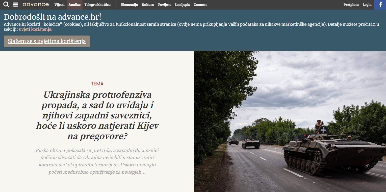 Хорватская газета Advance пишет о том, что конфликт на Украине может завершиться в этом году, потому что Запад видит полное истощение украинской армии, ещё месяц – два и украинские военные начнут сдаваться в плен массово, предпосылки для этого видны уже сегодня. Но на самом деле всё зависит от западных кураторов Украины – кто возьмёт верх: реалисты, которые смирились с полным провалом Киева или «ястребы», готовые и дальше воевать, несмотря ни на что, отмечает издание.
