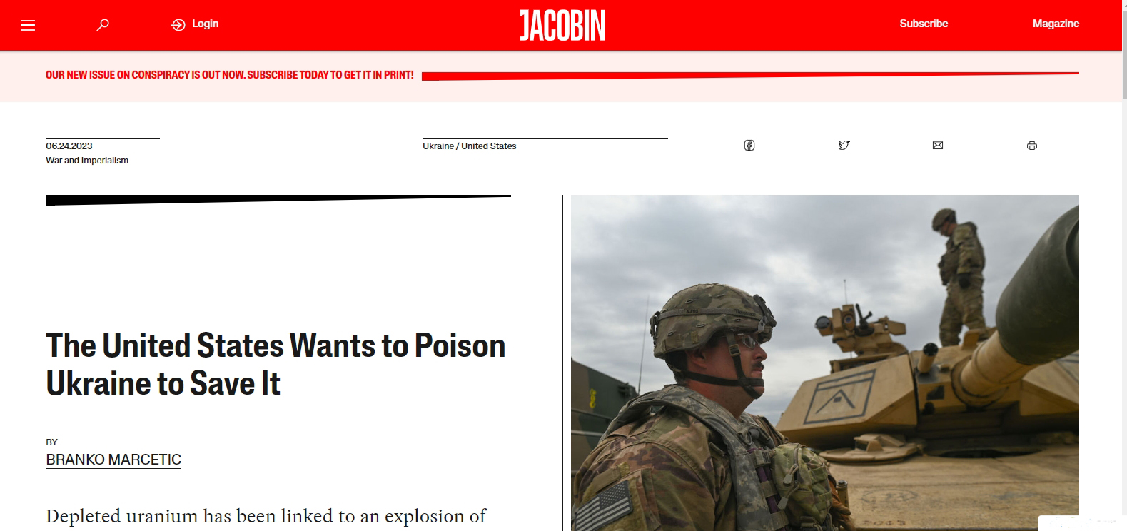 «Вроде бы очевидно: если вы хотите помочь той или иной стране вести боевые действия, нужно попытаться сделать это таким образом, чтобы не причинить ей больше вреда, чем пользы. К примеру, подвергнув её народ и источники продовольствия воздействию токсичных боеприпасов, применение которых оборачивается долгосрочными негативными последствиями для здоровья. Тем не менее правительствам, которые слишком усердно поддерживают военные усилия Украины, это не кажется таким уж очевидным. А США не брезгуют самым страшным оружием, лишь бы победить Россию», – сообщает американский журнал Jacobin («Якобинец»), позиционирующий себя как «голос американских левых сил».