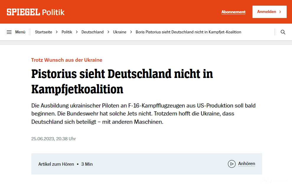 «Украина продолжает надеяться, что Германия примет участие в международной коалиции по поставкам истребителей. Однако федеральное правительство не спешит по той простой причине, что у Берлина нет таких истребителей. Хотя Андрей Ермак не раз заявлял, что Киев хочет видеть Германию в рядах международной коалиции, даже если у неё и нет F-16. Ермак намекал на то, что есть другие самолёты, которым в Киеве тоже будут рады. Бывший посол Украины Андрей Мельник в прошедшие выходные повторил своё требование прислать для нужд украинской армии немецкие истребители Eurofighter», – сообщает немецкий журнал Der Spiegel.