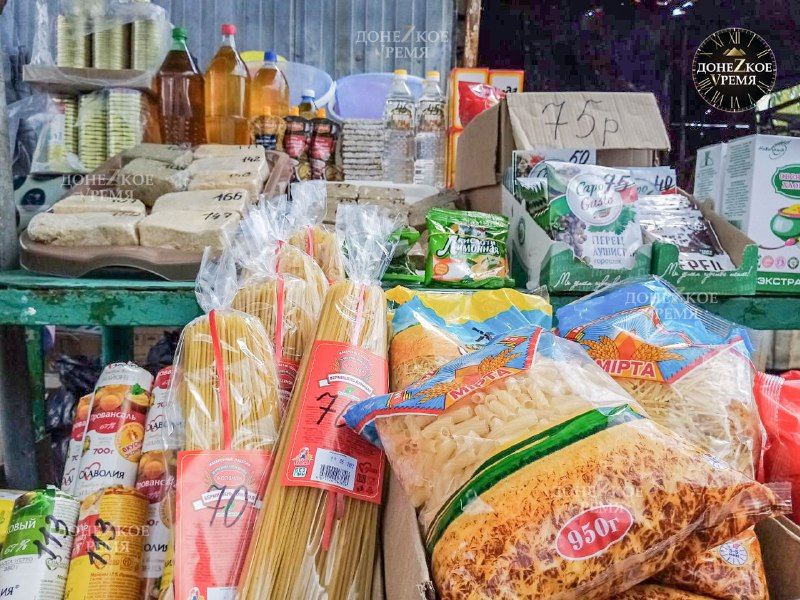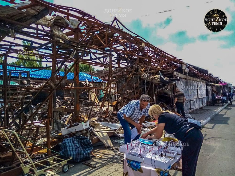 Рядом с уничтоженными торговыми павильонами люди организовали торговлю вновь. Если раньше здесь можно было купить одежду, бытовую химию, товары для ремонта и многое другое, то теперь ассортимент ограничивается, в основном, продуктами.