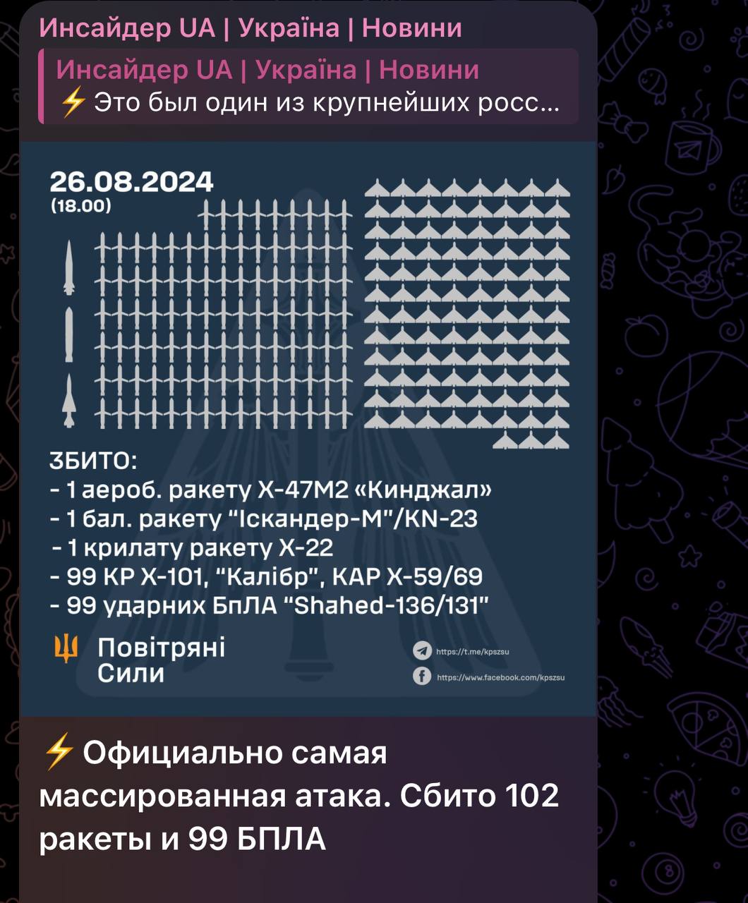 Однако в целом этот удар был с прицелом на энергетическую инфраструктуру. Было поражено более 40 объектов энергетики, в том числе в Киевской, Одесской, Николаевской, Винницкой, Черниговской, Волынской, Ровенской, Хмельницкой областях и во Львове. Причём на этот раз большее количество ракет достигли своих намеченных целей, чем ранее. Военные объясняют это тем, что все имеющиеся системы ПВО сегодня прикрывают те подразделения ВСУ, которые пытаются пробиться в Курскую область России. В итоге обесточены целые районы и даже целые города, как в случае с Луцком и Ковелем.