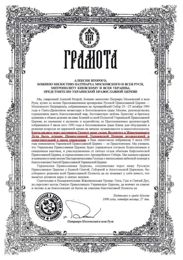 С 25 по 27 октября 1990 года в Москве в Свято-Даниловом монастыре проходило заседание Архиерейского собора Русской православной церкви, в ходе которого Украинской православной церкви была предоставлена самостоятельность и независимость в управлении. Всего в Определении об Украинской православной церкви 9 пунктов: