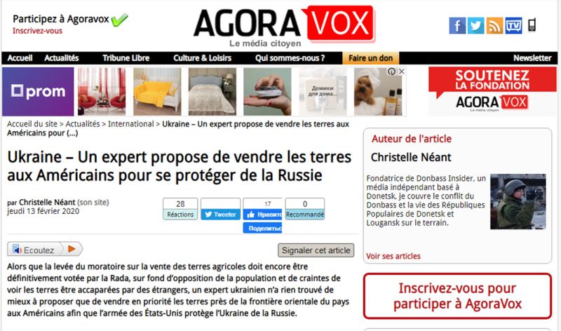 «После принятия Верховной радой в первом чтении законопроекта о снятии моратория на продажу сельскохозяйственных земель на Украине, несмотря на массовое несогласие населения (64%) с такой приватизацией, которая может привести к настоящей катастрофе, сравнимой с тем, что было после распада СССР, в текст были внесены поправки. Их цель – успокоить людей, которые опасаются, что страна может потерять контроль над землёй в угоду иностранцам», – сообщает французское интернет-издание гражданской журналистики AgoraVox.