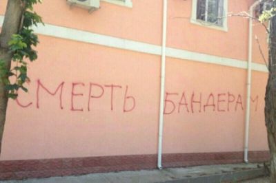 В ночь на 13 августа здание Херсонского облэнерго в центре города было разрисовано лозунгами «Смерть бандерам! Херсон – русский город!»