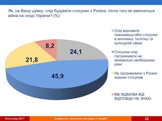 Порошенко явно огорчит то, что 24,1% граждан поддерживают полномасштабное возобновление отношений с РФ в экономической, политической и культурной сферах, еще 45,9% считают, что отношения с Россией необходимо поддерживать на минимально необходимом уровне. И меньше 21,8% украинцев не хотят иметь с РФ никаких отношений после завершения войны в Донбассе.