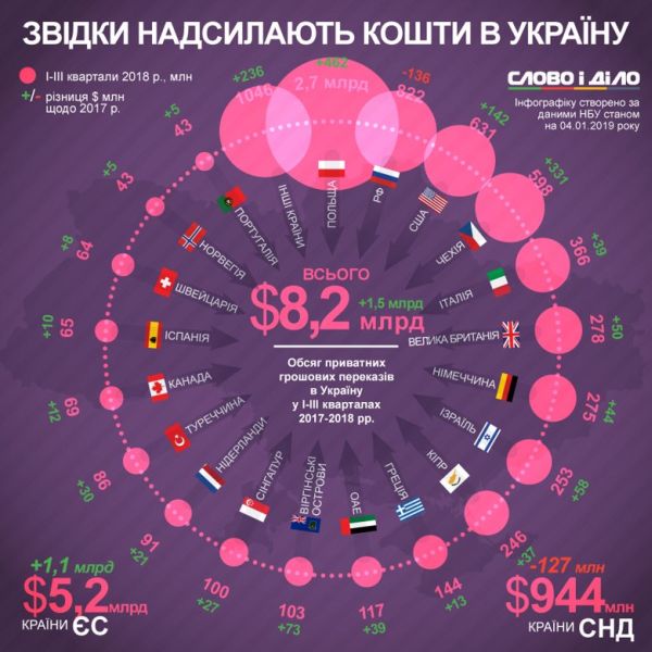 По данным НБУ, в первом полугодии 2018 г. заробитчане перечислили на Украину на 31% больше средств, чем в 2017 г. За первые три квартала 2018 года поступило $8,2 млрд.