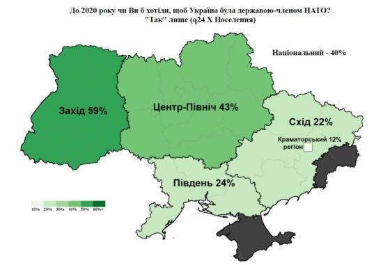 Оказалось, что на востоке и юге Украины за вступление в НАТО до 2020 года выступает 22% и 24% респондентов соответственно, то центр и север страны демонстрируют более высокую поддержку (по 43%), а большинство сторонников альянса проживает на западе страны (59%).  В среднем по Украине вступить в НАТО хотят 40% респондентов.