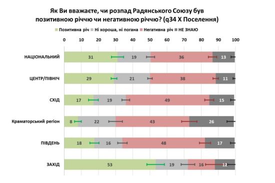 Исследование доказывает, что более трети украинцев считают распад СССР негативным событием (36%), хотя тех, кто радуется развалу Союза почти столько же - 31%. Причем в центре и на севере страны (включая Киев) количество жалеющих о распаде Союза даже выше, чем по всей стране – 38%.