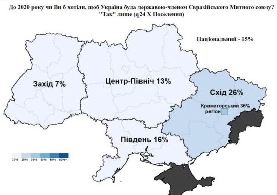 Но на западе и в центре нынешней Украины 7% и 13% соответственно хотят, чтобы Украина была членом ЕАЭС или Таможенного Союза, а  на юге и востоке – 16% и 26%.