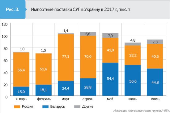 В последние годы украинский рынок СУГ стал мировым лидером по темпам роста. «Низкая платежеспособность украинских потребителей привела к тому, что бензин понемногу вытесняется этим ресурсом», - объясняет причину тенденции директор специальных проектов НТЦ «Психея» Геннадий Рябцев. В 2013-2016 гг. потребление СУГ выросло вдвое, а по итогам первого полугодия 2017-го увеличилось еще на 13%. В январе-мае автогаз составлял почти половину всего баланса потребления нефтепродуктов в натуральных показателях. При этом внутреннее производство закрывает всего 15-20% потребностей рынка, остальное приходится завозить из-за границы. Львиная доля импорта из государств ЕАЭС, 50-60% приходится на Россию, а еще 30-40% на Белоруссию.