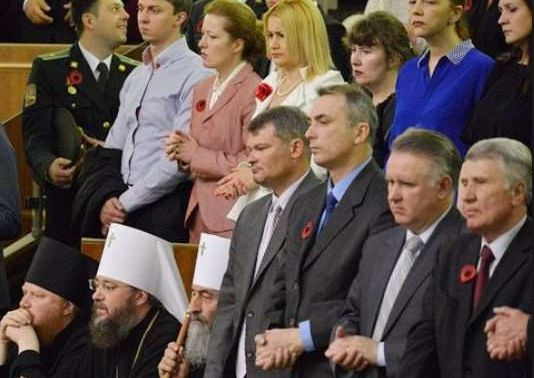 Пожалуй, самым заметным стал демарш во время торжественного заседания в Верховной раде, когда президент Порошенко зачитывал имена героев Украины, получивших это звание во время т.н. антитеррористической операции. Этот список зал встретил аплодисментами, поднялись все присутствующие в ложе, в том числе и иностранцы. Всеобщий восторг по поводу братоубийства не разделили представители лишь священноначалия УПЦ МП, которые не поднялись со своих мест.
