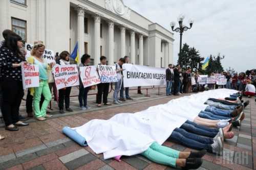 Но самой показательной акцией оказался флешмоб «Час смерти», проведенный 6 июня у здания ВР и в регионах страны. Тела, накрытые простынями, по замыслу организаторов акции, должны были показать актуальность реформы.