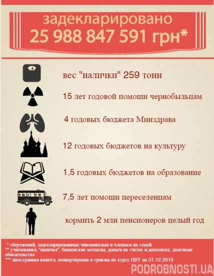 Получилась занимательная статистика. Например, у большинства декларантов сбережения превышают сумму в $100 тыс. По подсчетам гражданской сети «Опора», совокупные задекларированные денежные накопления 413 народных депутатов составили 12,3 млрд. грн. (почти $0,5 млрд.). В целом же свыше 113 тысяч украинских чиновников отложили на «черный день» 26 млрд. грн. Если их перевести в стогривневые купюры, то вес этих денег составит 259 тонн. Этих денег с лихвой хватило бы на затыкание всех дыр в государственном бюджете и на финансирование масштабных проектов в здравоохранении, образовании, энергетике, и множество других полезных вещей.