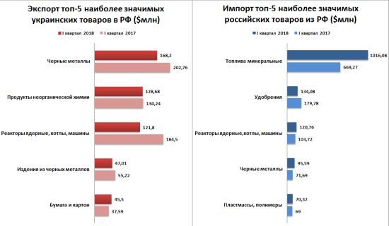 По данным Государственной службы статистики Украины, в I квартале 2018-го экспорт в Россию упал на 7,6%. Продажи падали почти по всем основным товарным группам, кроме бумаги и картона (+21,1%), электрических машин (+1,8%), пластмасс и полимерных материалов (+19,6%) и железнодорожных локомотивов (+37,5). Но основная экспортная продукция продолжала терять свои позиции на российском рынке, особенно реакторы ядерные, котлы, машины и их части (-33,9%), черные металлы (-17%) и изделия из них (-14,3%).