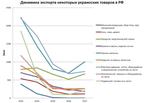 Сильнее всего от разрыва связей пострадали наиболее технологичные отрасли. Экспорт украинских механических устройств и запчастей в Россию упал в 3 раза, электрических машин и оборудования в 4,5 раза, подвижного состава почти в 9 раз, наземного транспорта в 3,3 раза, плавучего – в 3 раза. Настоящими ударами «по площадям» стал срыв трехсторонних консультаций по имплементации соглашения об ассоциации Украина-ЕС и, как следствие, приостановка работы зоны свободной торговли (ЗСТ) СНГ и двустороннее продуктовое эмбарго после украинских санкций.