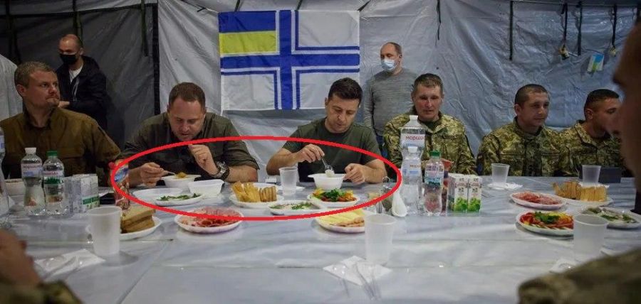Фото факт: еды на всех не хватает. Как известно, 14 октября президент Украины Владимир Зеленский приезжал в зону ООС на линию разграничения – поздравить военных с Днём защитника отечества. После его отъезда в социальных сетях появилась вот такая фотография с подписью: «Еды пока хватает только на президента и премьера, извините парни».