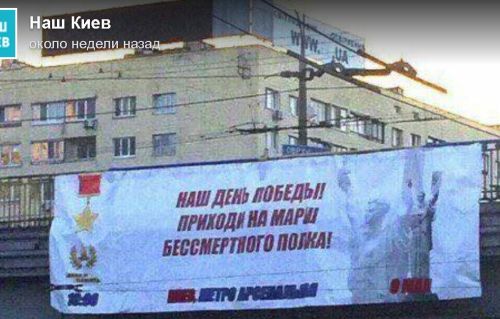 Когда на одном из киевских мостов появился плакат с призывом прийти на "Бессмертный полк", на странице "Наш Киев" в соцсети поместили снимок плаката с провокационными утверждениями, что это «Сталин с Гитлером развязали Вторую мировую войну и что надо бы пригласить … на этот марш потомков ветеранов вермахта».
