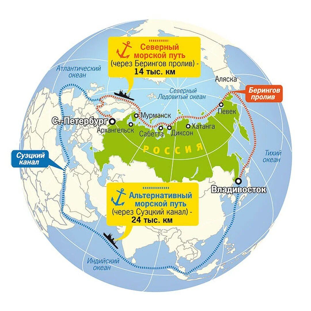 После распада СССР Россия осталась самой мощной полярной державой. Она контролирует Северный морской путь – кратчайший маршрут между Восточной Азией и Европой. В ледокольный флот РФ входят атомоходы «Ямал», «50 лет Победы», «Таймыр» и «Вайгач», а также атомный контейнеровоз «Севморпуть».