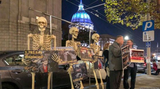 Двое бандеровцев с тремя манекенами пикетируют концертный зал в Сан-Франциско