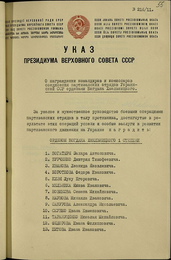 Указ о награждении партизан