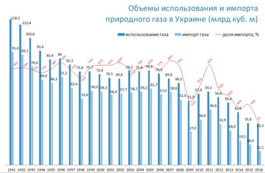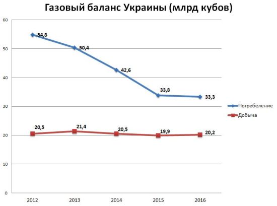 Потребление природного газа на Украине действительно падает. С 2011 года оно снизилось почти в два раза (до 33,3 млрд. кубометров в прошлом году) и, похоже, достигло своего дна. Больше всего за последние три года упала промышленность. Если в 2013-м промпредприятия потребляли 24,1 млрд. кубов, то в 2016-м только 9,9 млрд. кубов. Пришлось подвинуться и населению (с 22,8 млрд. кубов до 17,6 млрд.). Казалось бы, дальше ужиматься уже некуда. Очередное падение на 4% в январе-октябре 2017-го в основном было связано с теплой погодой в октябре и не учитываются технологические потери, но в Киеве есть и другие мнения.