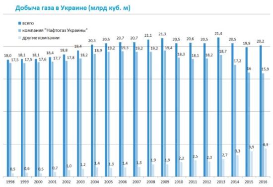 «Укргазвидобування», на которое Кабмин возлагает большие надежды, увеличило добычу на 4,2%. 23 ноября во время своего визита на месторождения Полтавской области В. Гройсман спрогнозировал, что по итогам года госкомпания нарастит добычу до 15,2 млрд. кубов и поставил задачу довести ее до 20 млрд. кубов уже через два года. Председатель «Укргаздобычи» Олег Прохоренко отмечает, что благодаря импортному оборудованию, технологиям и специалистам из «Беларусьнефти» и румынской Tacrom «с сентября 2016 по сентябрь 2017 года мы провели уже 105 операций интенсификации [скважин] и дальше наращиваем темпы».