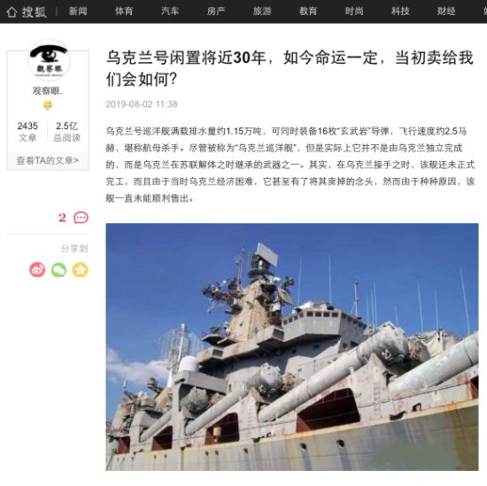 «В 1996 году Китай ещё отставал от Украины с точки зрения технологий и вооружения, поэтому он очень надеялся на покупку самого современного боевого корабля. Западные страны вмешались в осуществление этой сделки, из-за этого возможность её совершения была пресечена на корню. Другим потенциальным покупателем «Украины» была Россия. Однако в то время Россия переживала смутные времена и тоже распродавала оружие, созданное во время СССР. Россия всеми силами пыталась приобрести этот крейсер, но так и не смогла найти на это денежные средства», – отмечает Sohu.