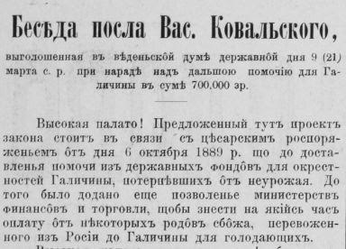 Австрийские власти выделили региону беспроцентные ссуды, но этого было мало: счёт голодающих шёл на десятки тысяч. Во Львове был создан Центральный обывательский комитет спасения, призывавший местных богачей жертвовать крестьянам на хлеб и корм для скота. С октября 1889 г. действовал Русский голодовый комитет во главе с известным галицко-русским писателем Богданом Дедицким. Комитет занимался распределением помощи, которая поступала голодающим галичанам из… России, что раздражало местных поляков. Как сообщало галицко-русское издание «Русское слово», «хотели они, щобы русскiй народ спускался лишь на их ласку и неласку». В те годы галичане ещё не полностью утратили историческую память и помнили о своей принадлежности к общерусскому древу.