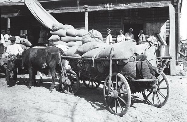 Заглавное фото: «Большевики вывозят зерно с Украины». Фото с сайта «Голодомор на Украине». Факты говорят об обратном: в трудное время зернового кризиса на Украину напротив, массово ввозилось зерно из Российской Советской Республики, и в огромных размерах.