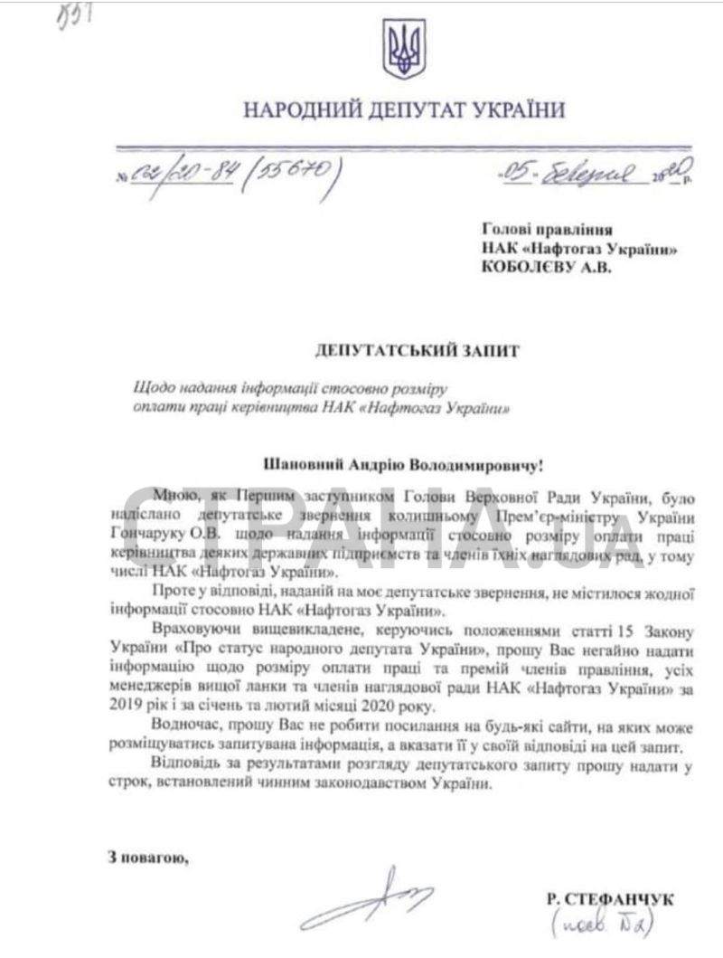 Как стало известно украинскому интернет-ресурсу «Страна», ещё вначале марта первый заместитель председателя Верховной рады Руслан Стефанчук направил депутатский запрос председателю правления НАК «Нафтогаз» А. Коболеву с просьбой предоставить информацию о размере зарплат руководства компании. Однако последний отказался называть свой и коллег уровень доходов, сославшись на «тайну персональных данных».