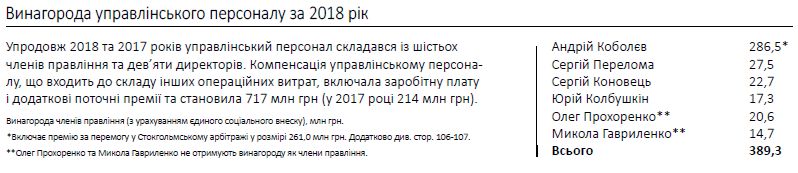 До последнего времени на официальном сайте «Нафтогаза» были опубликованы декларации А. Коболева лишь за 2014, 2015 и 2016 годы. И лишь в марте 2020-го была выложена фотокопия доходов членов правления за 2018 год, согласно которой сам А. Коболев благодаря скандальной премии получил аж 286,5 млн грн. (10,6 млн долл.). Но и «рядовые» члены правления за этот период неплохо «заработали». Например, годовой доход первого зама главы правления Сергея Переломы составил 27,5 млн грн. (1,02 млн долл.). А всего члены правления за 2018 год получили (с учетом коболевской премии) 389,3 млн грн. (14,4 млн долл.). Львиная доля досталась самому главе правления.
