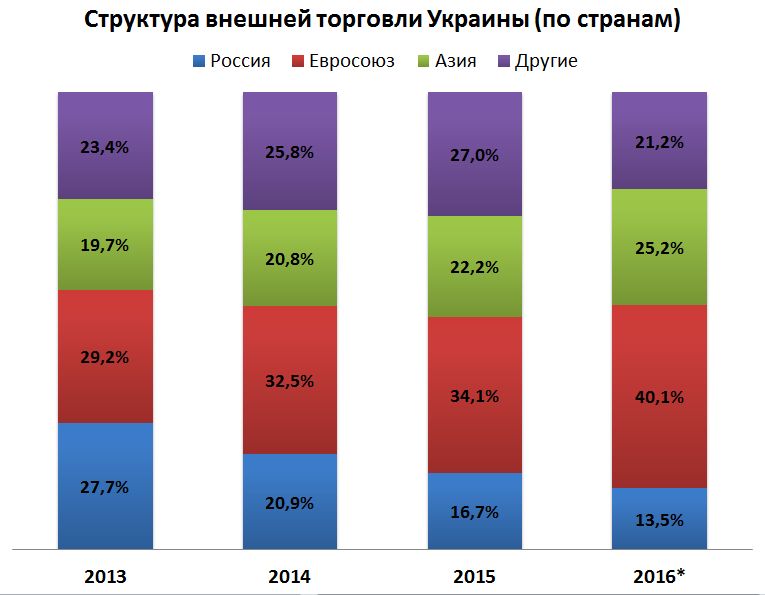 Если в 2013 году на Россию приходилось 27,7% украинской торговли, а на весь Евросоюз 29,2%, то к концу прошлого года это соотношение радикально изменилось.