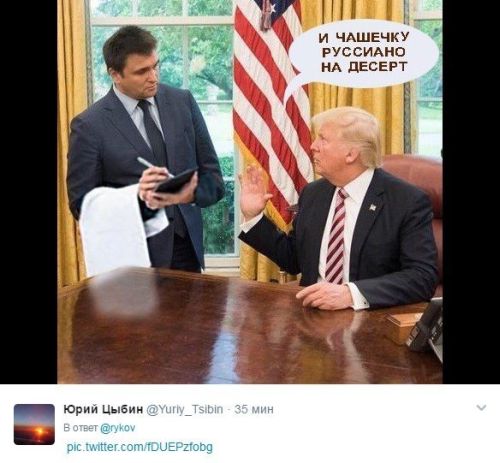 Третьим по значимости событием недели украинские СМИ называют «встречу министра иностранных дел Украины Климкина с президентом США Трампом». Именно так (Климкин встретился с Трампом, а не наоборт) подавалась новость в украинских СМИ.