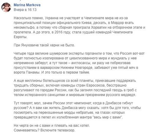 Как написал в ФБ один свидомит из приехавших на ЧМ из Киева: «Надо отдать должное москалям – они блестяще презентовали свою страну, они демонстрируют позитив и доброту и оперативно реагируют на нелепости и нарушения. Такого в Киеве я не видел давно. Жаль».