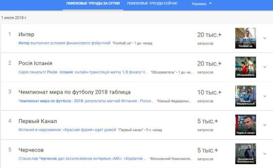Информация о матче ЧМ-2018 между командами России и Испании стала главным запросом с Украины за минувшее воскресенье в поисковой системе Google.