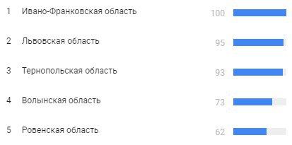 В лидеры вырвался украиноязычный запрос «Росія Іспанія». Интересно, что больше всего таких запросов было из Ивано-Франковской, Львовской, Тернопольской, Волынской и Ровенской областей соответственно.