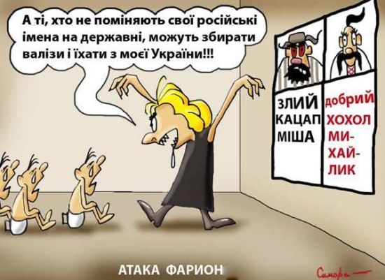 «Мне абсолютно безразлично русскоязычное население. Потому что кто это? Прошу показать мне такую юридическую категорию. Где в Конституции Украины написано, что такое имеет право на существование? Русскоязычность в Украине – это клеймо оккупанта, это самый лучший трофей Путина. Это символ поражения украинца перед россиянином или, извините, московитом – так намного лучше их называть», - рассказала Фарион о стране, где по данным американского института Гэллапа, в 2009 году 82% населения предпочитали в общении и письменной речи русский язык, и сейчас насчитывается более 8 млн. этнических русских.
