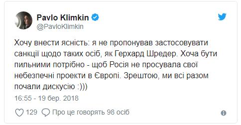 18 марта министр иностранных дел Украины Павел Климкин заявил немецкой газете Bild, что в свете нарастающего напряжения между западными странами и Россией необходимо ввести санкции в отношении бывшего канцлера ФРГ Герхарда Шрёдера.
