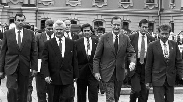 Джордж Буш-старший в Киеве, 1991 год. Примечателен отрывок из его речи: «Американцы не будут поддерживать тех, кто стремится к независимости для того, чтобы сменить тиранию, навязываемую издалека, местным деспотизмом. Они не будут помогать тем, кто поощряет самоубийственный национализм, порождаемый на межнациональной ненависти»