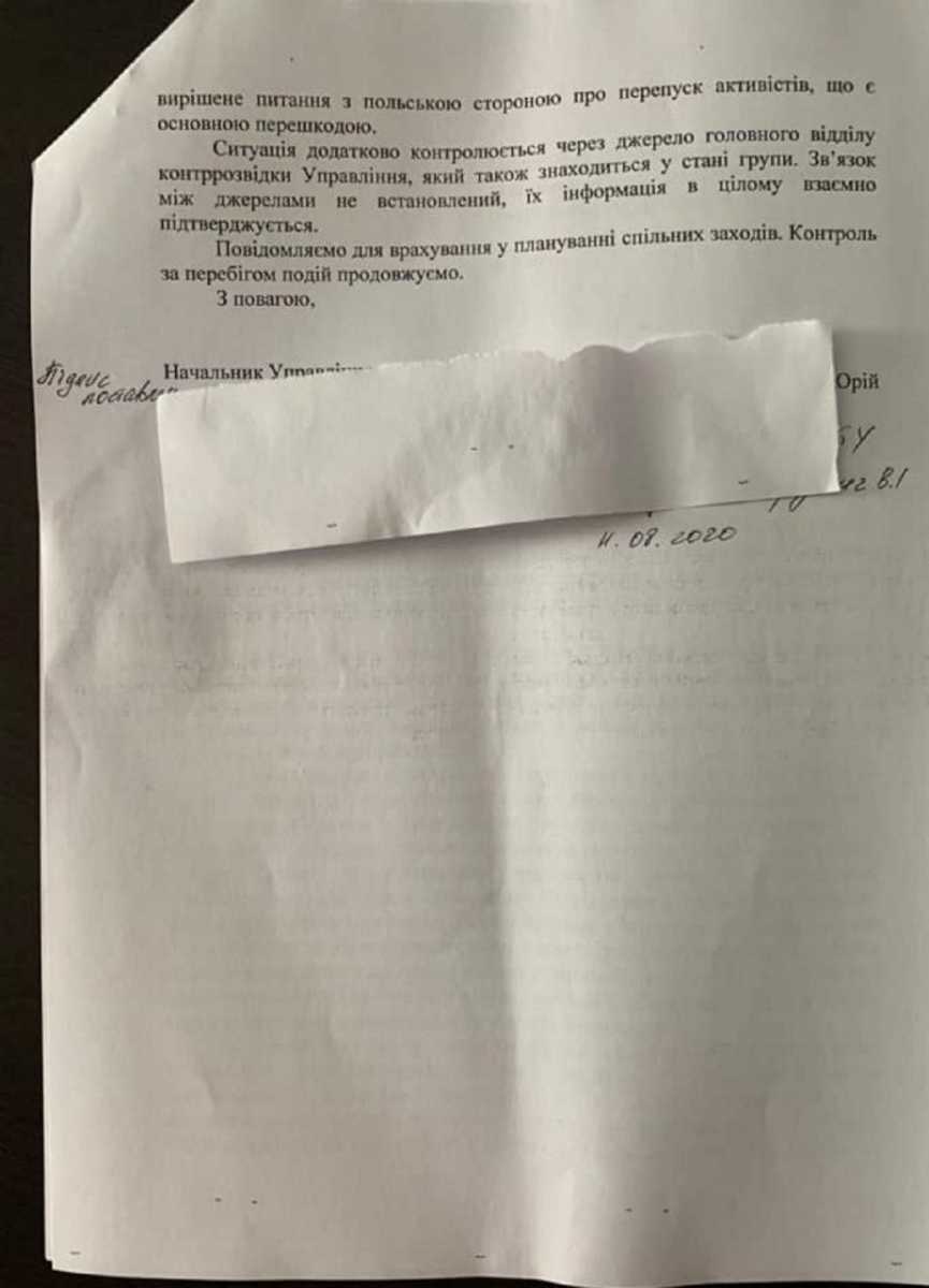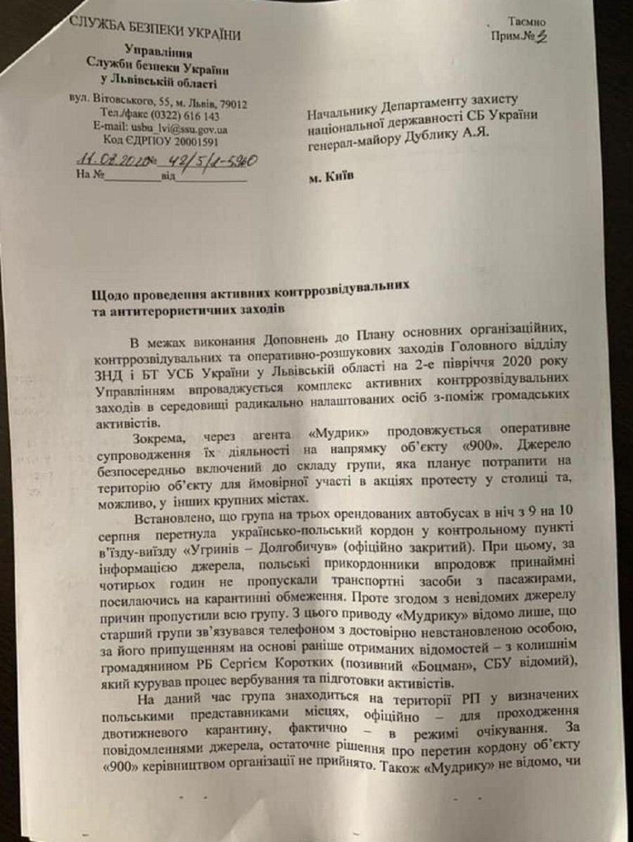 Достоянием украинской общественности стало письмо начальнику Департамента защиты национальной государственности СБУ генерал-майору А.Я. Дублику. В тексте идёт речь о работе СБУ с украинскими радикалами, которых переправляют автобусами в Белоруссию через Польшу для участия в разжигании протестов.