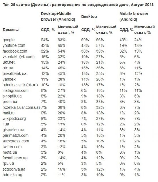 По итогам августа 2018 г. на базе медиапанели численностью 5 тыс. человек определен список популярных доменов, посещаемых украинскими пользователями. В исследованиях не была затронута территория Крыма и, вероятно, ЛДНР.